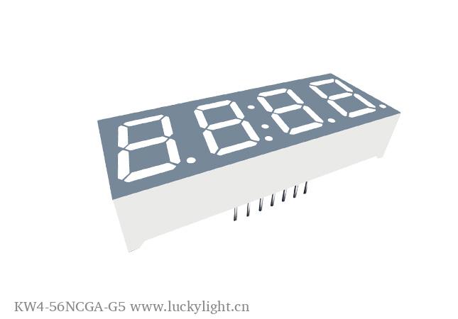 KW4-56NCGA-G5 is a 0.56-inch (14.2mm) pure green through-hole four-digit 7-segment LED display, also referred to as a 0.56-inch (14.2mm) pure green through-hole four-digit LED numeric display. This device features a common cathode configuration with white segments and a gray surface.